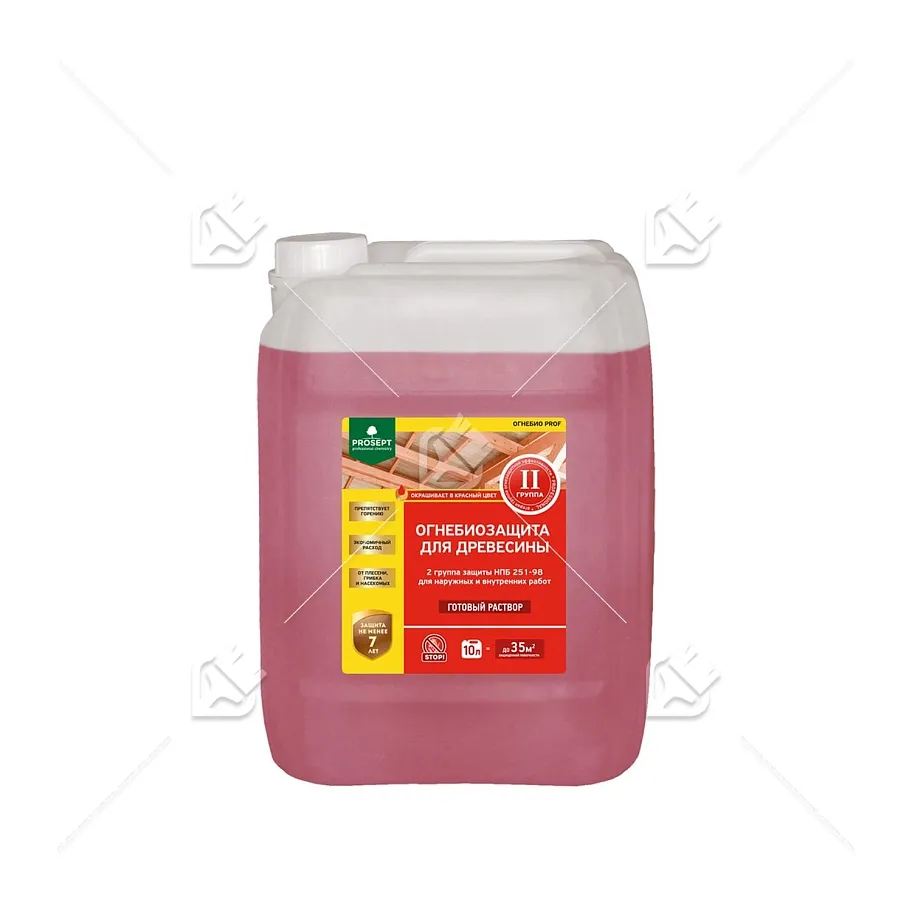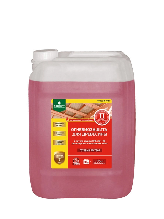 Просепт (Prosept) Огнебио Проф-2 – комплексная огнебиозащитная пропитка для древесины, используемой внутри помещений и на открытом воздухе без прямого воздействия атмосферных осадков и контакта с грунтом. Пропитка защищает древесину от возникновения и распространения огня, а также от воздействия биологических агентов (дереворазрушающие грибки, насекомые и их личинки). Переводит древесину в трудновоспламеняемый материал (II группа огнезащиты по НПБ 251-98) уже при расходе 300 г/м2. Подходит для обработки как новых конструкций, так и конструкций, ранее обработанных огнезащитными составами. Огнебиозащитная пропитка устойчива к старению, не высаливается и не выщелачивается, легко покрывается любыми ЛКМ. Состав не оказывает негативного воздействия на свойства древесины, не изменяет ее структуру, не изменяет естественного цвета древесины (базовая модификация А, модификация Б содержит краситель для контроля нанесения), не препятствует дальнейшей обработке, склеиванию и окраске. Гарантированный срок защиты - не менее 7 лет. Подтверждено тестами.