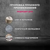 Грунтовка глубокого проникновения, которая используется для обработки стен под покраску, штукатурку, кладку плитки, установку теплоизоляционных плит. Значительно снижает впитываемость и повышает прочность поверхностей. Может применяться как грунтовка для внутренних работ и как грунтовка для внешних работ. Эффективна для различных оснований — обычного и ячеистого бетона, штукатурки, цементных стяжек, ДСП, гипсокартона, камня.